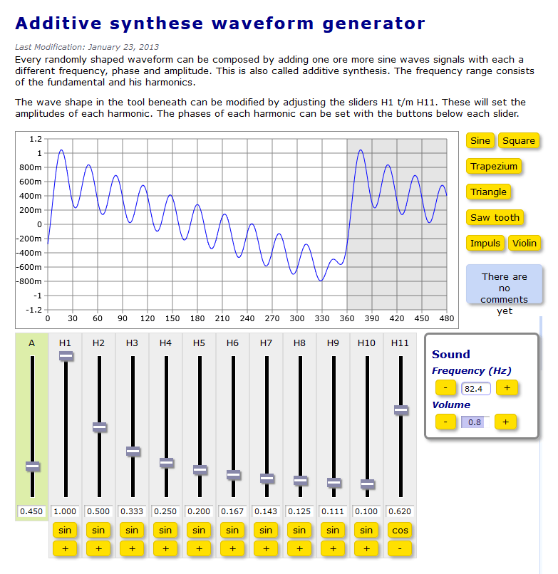 Prilikom prvog pokretanja mrežne aplikacije u gornjem se dijelu iscrtava fazni dijagram jednostavnog sinusnog signala frekvencije 440 Hz (A1). U donjem dijelu iscrtava se dvanaest klizača. Prvi (s lijeva) mijenja vertikalnu skalu dijagrama, no ne utječe na zvuk. Preostali klizači služe za upravljanje amplitudama (glasnoćom) svakog od jedanaest oscilatora. U startu je aktiviran samo prvi oscilator: generator bazne frekvencije. Još uvijek nema zvuka jer je kontrola ukupne glasnoće („Volume“) postavljena na nulu („off“). Klizači se mogu pomicati samo grafički (prstom, mišem) – nije omogućen precizan unos (vidljivih) realnih vrijednosti između 0 i 1. Kontrola ukupne glasnoće može poprimiti jednu od jedanaest dozvoljenih vrijednosti između 0.0 („off“) i 1.0 (0.0, 0.1, 0.2 … 1.0). Ispod svakog klizača nalaze se tipke [sin] i [+]. Tipka [sin] mijenja funkciju pripadajućeg generatora iz sinusa u kosinus, dok [+] invertira val (pozitivne vrijednosti postaju negativne i obrnuto).