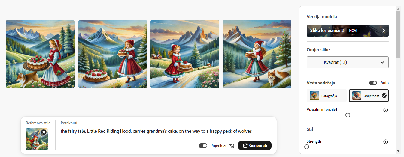 Prvi primjer je generiranje određenog teksta koji sami smislimo, a program ga pretvori u sliku. Tekst je potrebno pisati na engleskom jeziku i potrebno je navesti što više pojedinosti za sliku koju želimo dobiti. Da bismo dobili sličice za obradu lektire braće Grimm Crvenkapica, možemo upisati sljedeće: the fairy tale, Little Red Riding Hood, carries grandma’s cake, on the way to a happy pack of wolves. Program svaki puta generira drugačije primjere. Slike je moguće preuzeti na računalo kao i generirati slične prema referenci stila. Sami biramo verzije modela koje ćemo koristiti, oblik slike, vrstu sadržaja i stil. Na svakoj sličici nalazi se gumb za uređivanje.