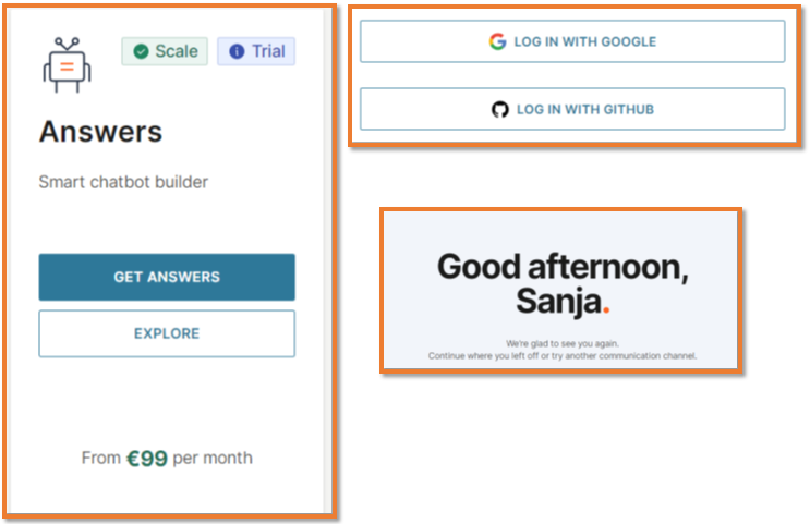 Platforma Answers (https://www.infobip.com/answers) korisnicima omogućuje besplatnu registraciju putem unosa adrese elektroničke pošte i osnovnih podataka, nakon čega slijedi verifikacija Infobip računa. Kako bi se osigurao pristup besplatnom probnom razdoblju i slanju besplatnih poruka, potrebna je i verifikacija telefonskog broja, pri čemu se naglašava sigurnost informacija. Nakon uspješne verifikacije, korisnici ulaze u sučelje koje omogućuje kreiranje, testiranje i implementaciju chatbotova temeljenih na pravilima ili umjetnoj inteligenciji.