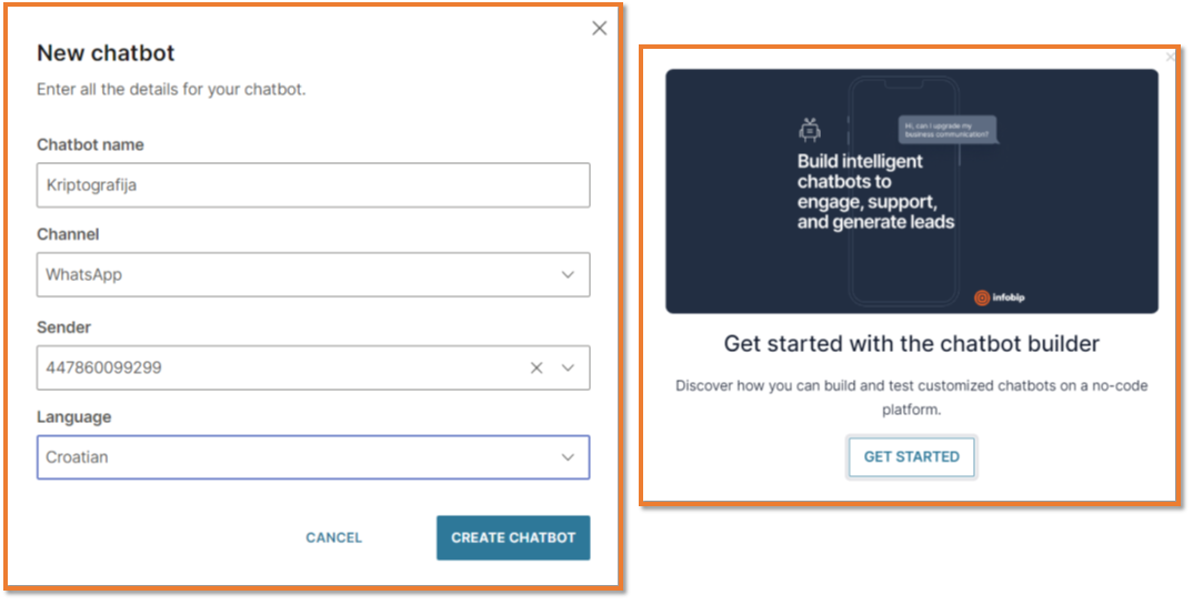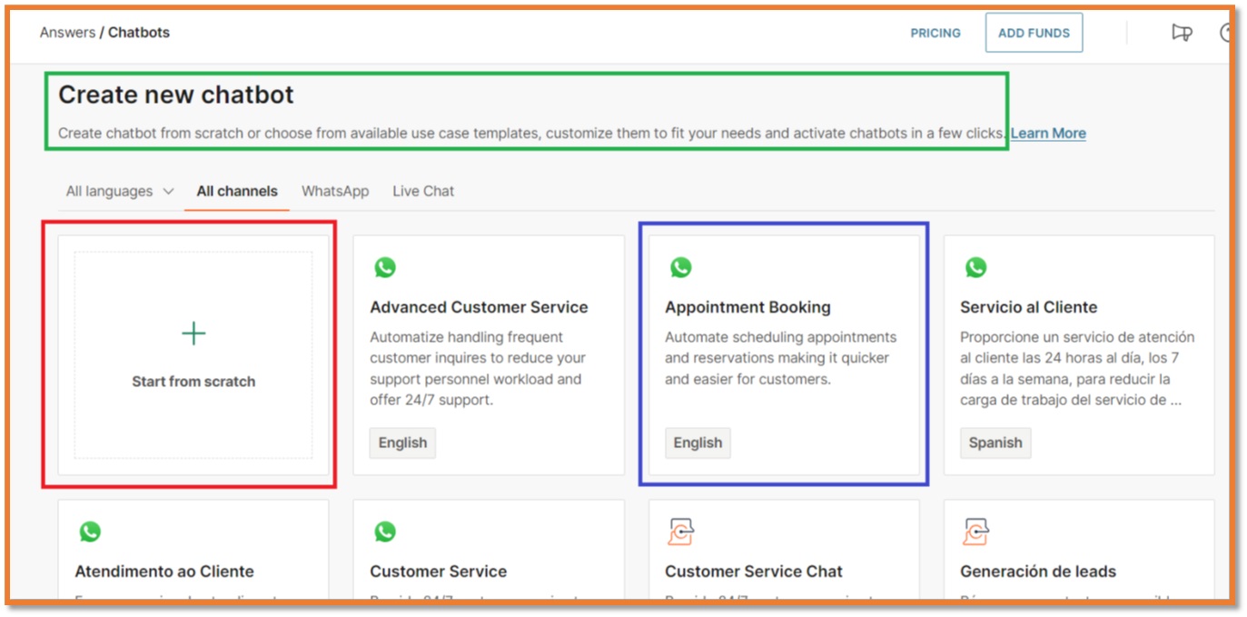 Proces izrade chatbota započinje na nadzornoj ploči (Dashboard) odabirom opcije „Započnite s predloškom“ ili stvaranjem novog chatbota „od nule“ (Start from scratch). Predlošci, temeljeni na unaprijed dizajniranim chatbotovima, pružaju primjere sadržaja i konfiguracija koje se mogu iskoristiti kao temelj za vlastiti dizajn. Ova funkcionalnost olakšava proces izrade, štedi vrijeme i omogućava brzu implementaciju. Nadzorna ploča predstavlja centralno upravljačko središte za sve aktivnosti vezane uz chatbotove. Ovdje korisnici imaju mogućnost pregledavanja, uređivanja, stvaranja, brisanja i izvoza chatbota. Također, pruža pristup analitici specifičnoj za chatbota, što je ključno za praćenje njegove učinkovitosti i optimizaciju funkcionalnosti.