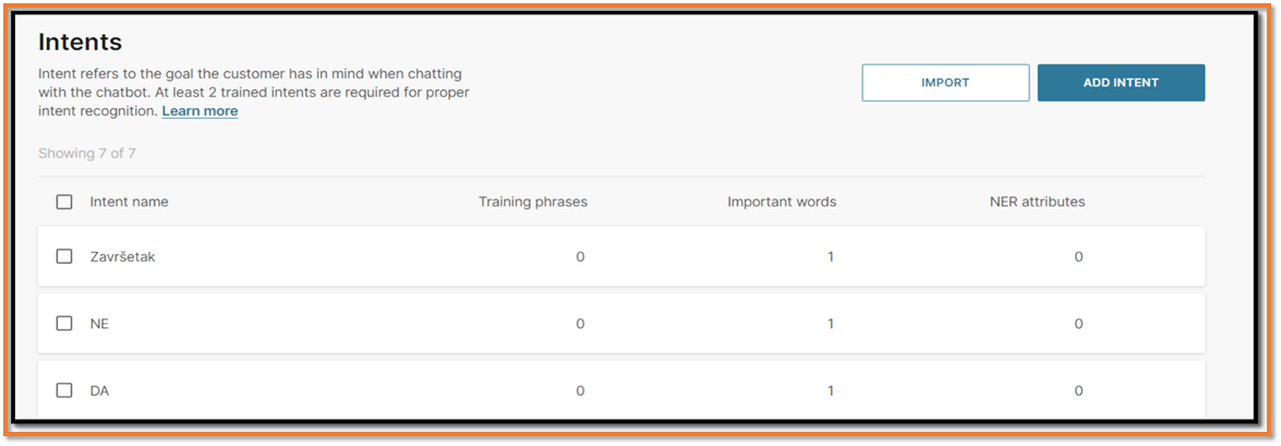 Namjere (Intents) predstavljaju temeljnu komponentu za definiranje ciljeva tijekom razgovora s krajnjim korisnicima. Svaka namjera predstavlja specifičan cilj ili zahtjev koji korisnik ima tijekom interakcije s chatbotom. Definiranje namjera omogućuje chatbotu precizno tumačenje korisničkih zahtjeva što rezultira pružanjem odgovarajućih odgovora ili usluga. Ova komponenta ima važnu ulogu u procesu treniranja chatbota, doprinoseći postizanju visoke razine točnosti i uspješnosti u interakciji s korisnicima. Kroz precizno definirane namjere, chatbot stječe sposobnost prepoznavanja širokog spektra korisničkih ciljeva, što omogućuje i bolje prilagođavanje njihovim potrebama. Sveukupna funkcionalnost chatbota ovisi o kvaliteti i broju definiranih namjera.