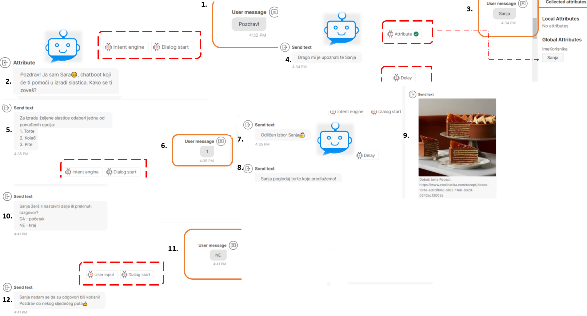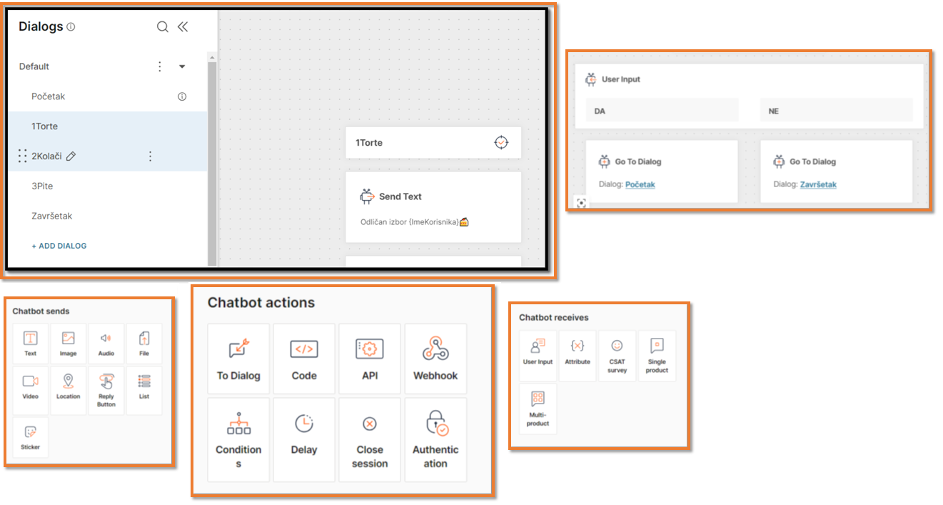 Dijalozi predstavljaju sekcije chatbota koje obavljaju određene zadatke i sadrže cijele razgovore dok su elementi unutar dijaloga odgovorni za specifične funkcije, kao što su slanje ili primanje poruka, unos teksta, slika, audio-zapisa i slično. Dijalozi često služe za organizaciju logičkih segmenata razgovora pa tako primjerice unutar nekog dijaloga mogu biti definirane različite namjere i/ili odgovori kako bi chatbot pravovaljano odgovorio na postavljena pitanja ili zahtjeve korisnika. Elementi predstavljaju blokove dijaloga. Svaki element odgovoran je za određenu interakciju s korisnikom. Primjerice, element unosa teksta omogućuje korisnicima postavljanje pitanja, dok element slanja slike omogućuje chatbotu slanje slike korisnicima. Kombinacijom dijaloga i elemenata, chatbot postaje složeni sustav sposoban za interakciju s korisnicima na različite načine.