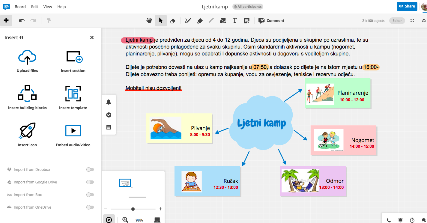 Možemo reći da svaki dokument predstavlja praznu online ploču na kojoj surađuje više korisnika dodavajući različiti sadržaj: tekt, slike, grafičke oblike, ikone, medijske datoteke i sl. Sadržaj se može unositi na praznu ploču, a može se koristiti i jedan od mnoštva gotovih predložaka: projekti, umne mape, vremenske crte, dijagrami, brainstorming…