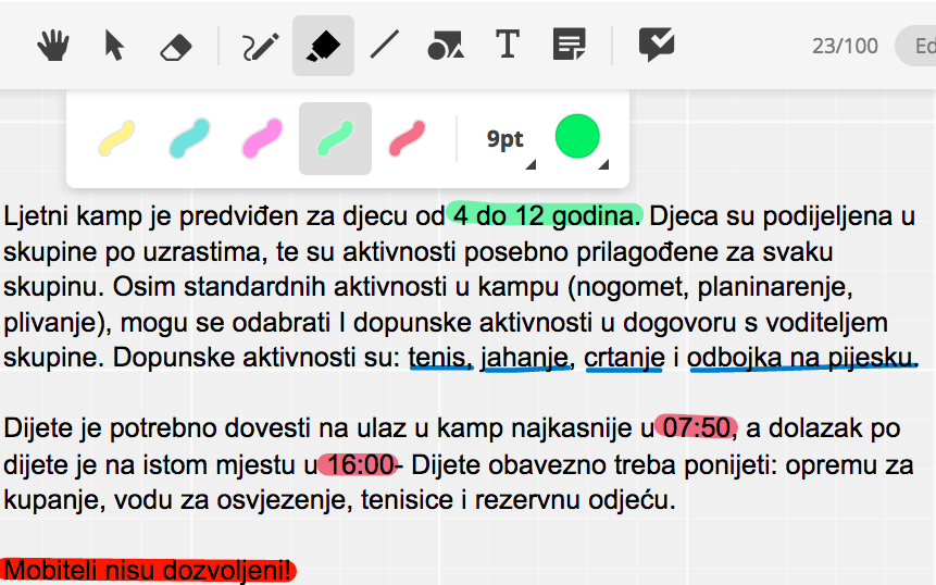 - Označavanje teksta – dijelove teksta koji je upisan ili kopiran iz drugih programa dodatno se može istaknuti označavanjem (highlights) ili pocrtavanjem (scribble) u različitim bojama.