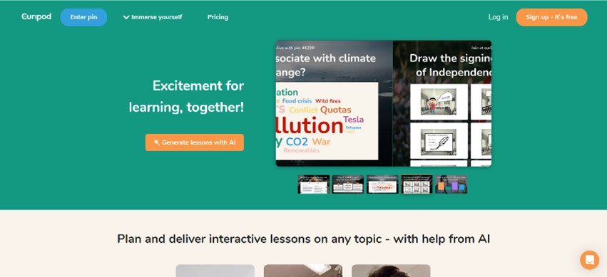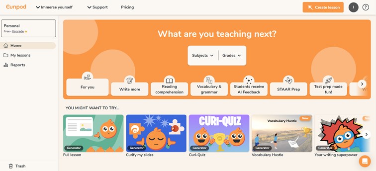 Curipod je digitalni alat koji je vrlo jednostavan za korištenje. Stvara zanimljive interaktivne lekcije koje su zabavne ne samo učenicima već i učiteljima. Tijekom trajanja lekcije omogućava pravovremeno dobivanje povratnih informacija tako da učitelji mogu lakše pripremati i prilagođavati nastavne materijale. Iako umjetna inteligencija stvara slajdove na engleskom jeziku, njih je lako prevesti pomoću prevoditelja tako da se materijali mogu vrlo brzo prilagoditi na željeni jezik.