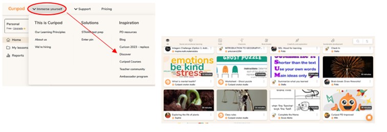Postoji i opcija pretraživanja lekcija i aktivnosti među izrađenim materijalima zajednice učitelja (Immerse yourself → Discover). Upisom područja ili teme koja vas zanima predložiti će se neki od već gotovih materijala. Odabranu lekciju možete dodati u svoje materijale te ju prema potrebi dorađivati.