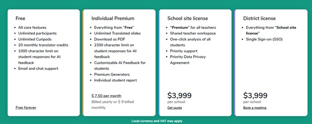 Postoje besplatna i premium opcija korištenja. Besplatna verzija sadrži osnovne značajke, neograničen broj sudionika i izrađenih Curipoda. Dostupno je 20 kredita mjesečno koji se mogu koristiti za prijevod teksta na slajdovima. Prisutna je i podrška putem chata ili mail adrese. Nije moguće preuzeti izrađene materijale (koriste se samo online).