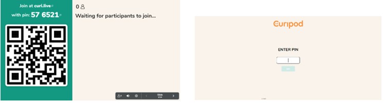 Na prvome slajdu nakon naslovnog će se pojaviti QR kod i pin pomoću kojeg se učenici mogu pridružiti interaktivnoj prezentaciji. QR kod ih direktno vodi na stranicu www.curi.live na kojoj će se automatski upisati pin broj. Moguće je i da učenici do materijala dođu samostalnim upisom stranice u tražilicu na kojoj će onda upisati pin broj. Moguće je raditi potpuno anonimno i poluanonimno. Ako se dopusti poluanonimni način učenici će morat upisati svoje ime, ali će im alat dati i nadimak (npr. Znatiželjni vulkan) tako da sve što rješavaju pod svojim nadimkom. Jedino učitelj ima uvid tko je tko.