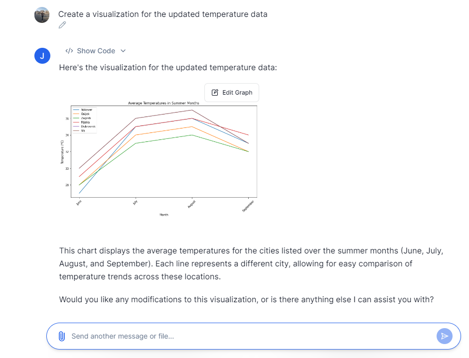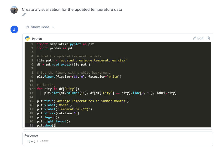 Nakon što je datoteka sa skupom podataka učitana, pojavljuje se na popisu izvora podataka i može započeti njihova analiza putem razgovornih upita (Chat with files). Julius AI razumjet će naš upit i vratiti rezultate u obliku tablica, grafikona, dijagrama i drugih vizualizacija.
