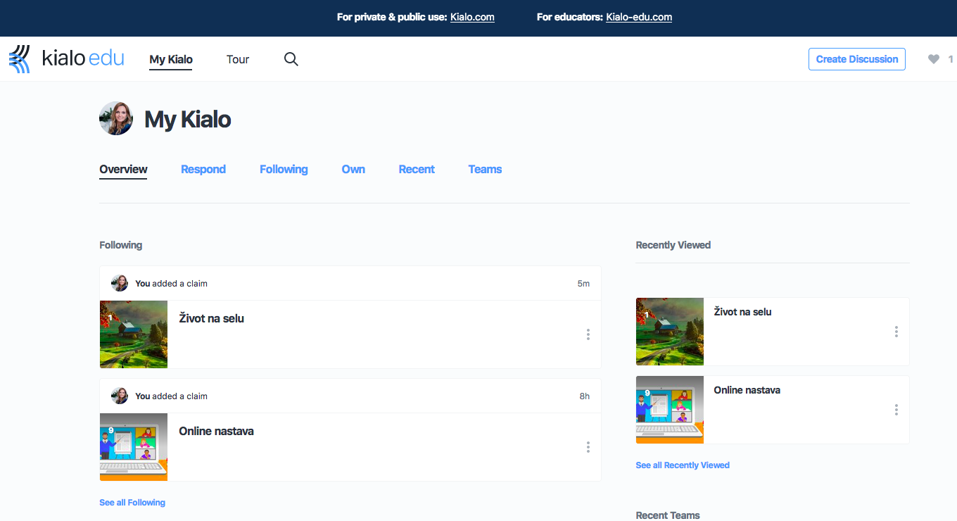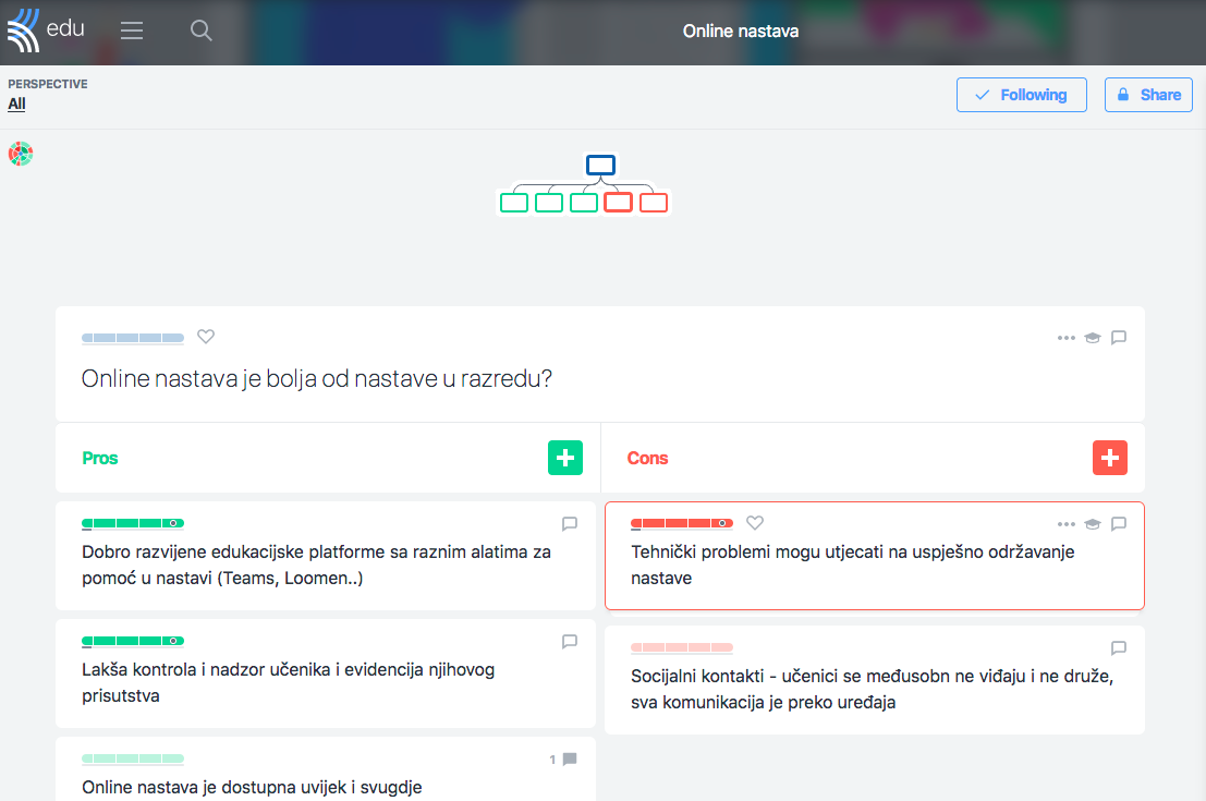 Upravo u tome može pomoći Kialo, interaktivna platforma za strukturiranje argumenata i provođenje online debata. Kialo Edu prilagođena je verzija te platforme, besplatna i namijenjena korištenju u nastavi, a nalazi se na adresi: https://www.kialo-edu.com/. Korištenjem ovakvog alata debata postaje pregledna i strukturirana, sa jasno uočljivim afirmacijskim i negacijskim argumentima koji se mogu složiti prema prioritetima i važnosti.