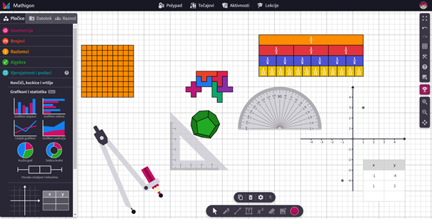 - Algebra (algebarske pločice, vaga ravnoteže, koordinatni sustav i tablice, varijabilni klizači)