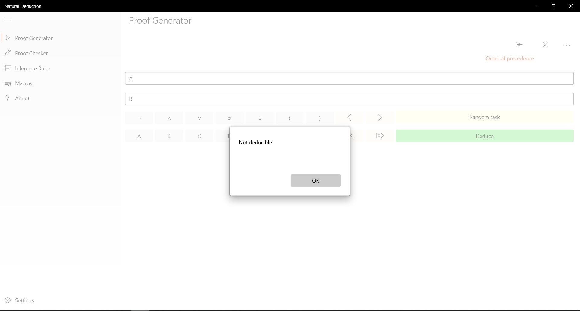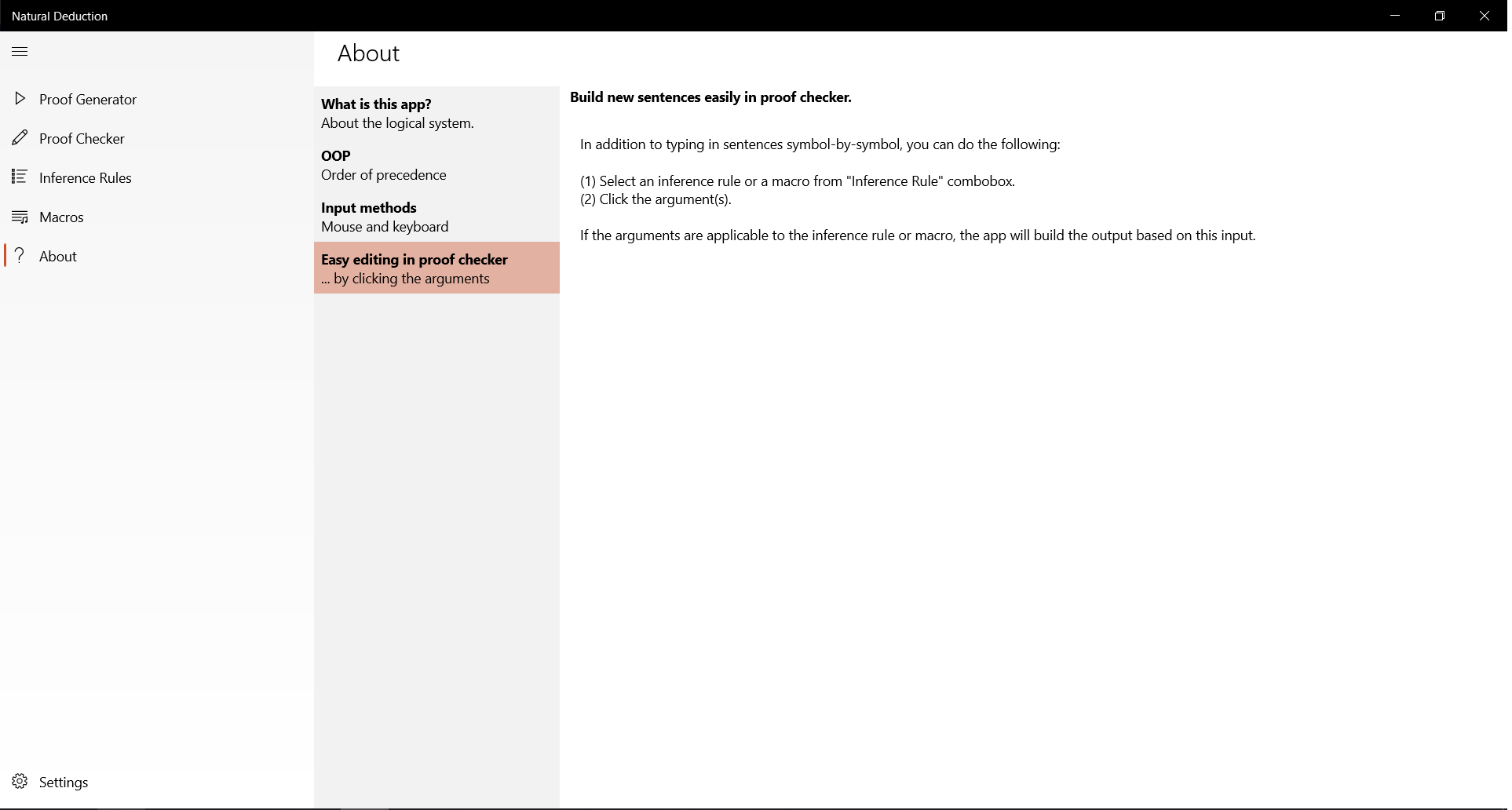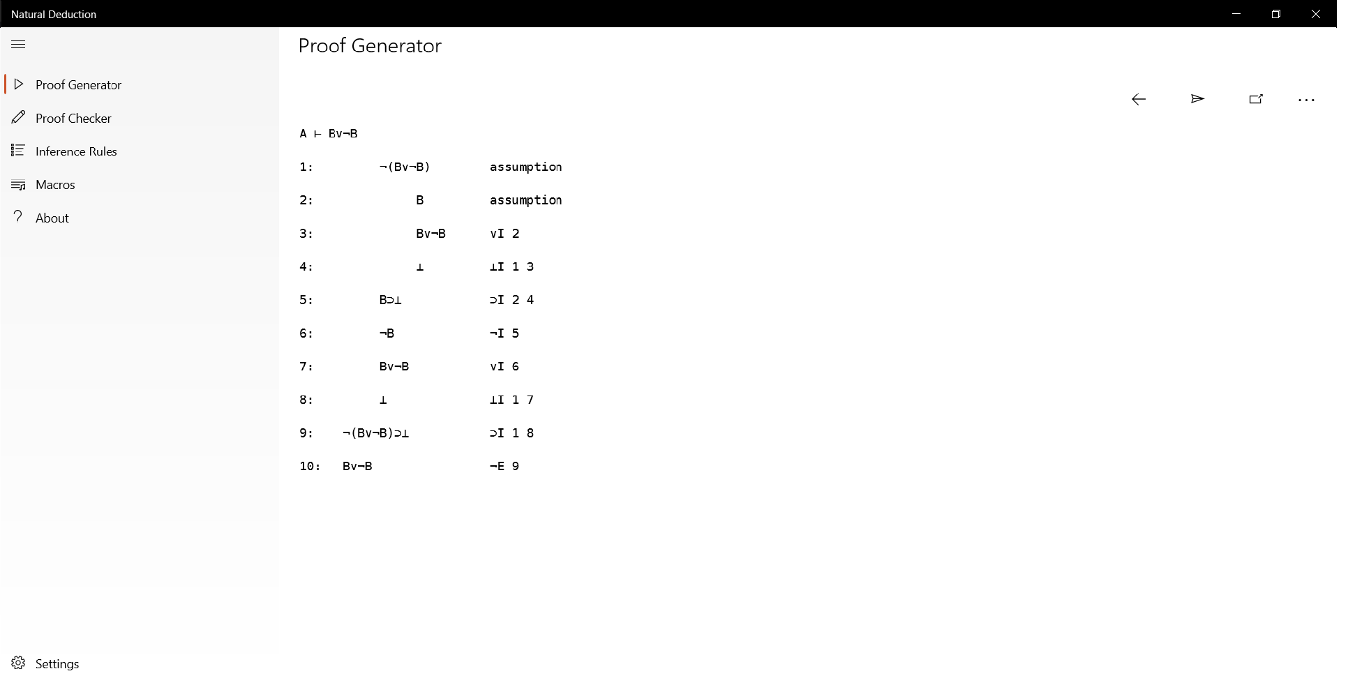 Alat generira dokaze za istinito-funkcionalnu i modalnu logiku. Može provjeraviti dokaze koje ste sami gradili, a možete izabrati opciju nasumičnog dokaza kojeg alat sam generira. Vaši se dokazi mogu spremiti na vaš uređaj.