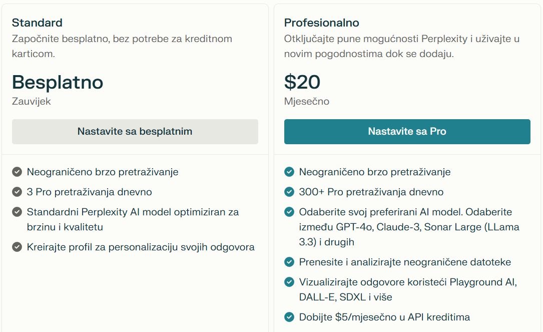 Perplexity.ai besplatan je alat za pretraživanje i interakciju s umjetnom inteligencijom a dostupan je putem poveznice https://www.perplexity.ai/ . Korisnici mogu koristiti osnovne funkcionalnosti bez ikakvih troškova, što ga čini dostupnim široj publici. Postoji i Pro verzija koja nudi dodatne značajke, kao što su veći broj upita i pristup naprednijim modelima poput GPT-4, uz mjesečnu pretplatu od 20 USD. Besplatna verzija omogućava korisnicima do pet upita s Copilot značajkom svakih četiri sata, što je ograničeno ali i dalje korisno za osnovne potrebe pretraživanja. Moguće je i preuzeti Perplexity.ai ekstenziju za Chrome iz Chrome web-trgovine, čime se osigurava brže pretraživanje iz adresne trake preglednika.