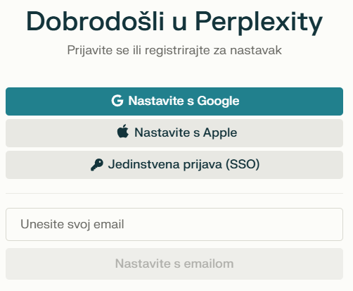 Registracija i prijava za besplatnu verziju Perplexity.ai izuzetno su jednostavne. Na početnoj stranici platforme dostupne su opcije za registraciju ili prijavu („Sign Up“ ili „Register“), koje zahtijevaju unos osnovnih informacija: e-mail adrese i lozinke. Nakon njihova unosa dovoljno je slijediti upute za potvrdu računa i proces registracije bit će završen. Odmah nakon registracije moguće je početi koristiti besplatnu verziju za pretraživanje i postavljanje pitanja.