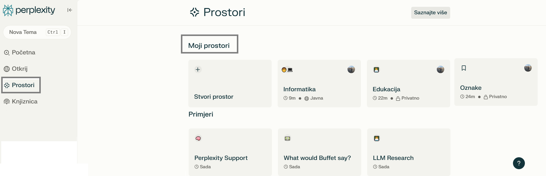 Izbornik „Prostori“ odnosi se na zajednice i specifične prostore unutar alata. Korisnici mogu pristupiti različitim grupama ili forumima gdje mogu postavljati pitanja, dijeliti informacije i komunicirati s drugim korisnicima. Prostori omogućuju interakciju i razmjenu znanja među članovima zajednice. (Slika 6 Izbornik Prostori). Svaki korisnik može kreirati svoje osobne Prostore u koje je moguće dodavati datoteke ili poveznice na resurse ali i pozvati druge sudionike da dodaju vlastite teme. Prostor je prvotno postavljen na privatno a korisnik ga po želji može učiniti javnim. Opcija “+ Dodaj u prostor” omogućuje organizaciju i upravljanje vlastitim informacijama unutar zajednica ili specifičnih tema. Ova je funkcionalnost korisna za grupiranje sličnih upita ili resursa, čime se olakšava pristup i pregled sadržaja.