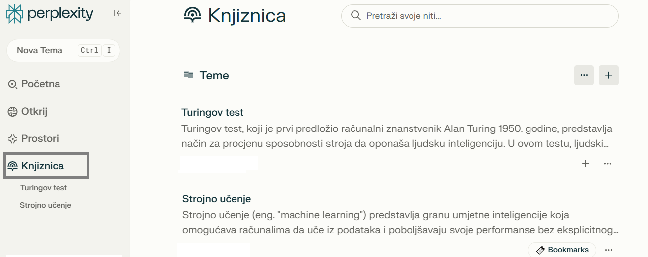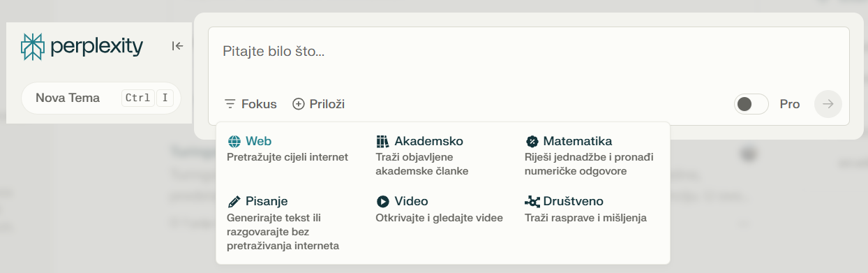 Funkcionalnost “Nova tema” (prečica: CTRL I) omogućuje brz početak novog razgovora ili teme unutar platforme. Korisna je za organizaciju i upravljanje različitim upitima. Ova opcija omogućuje odvajanje različitih tema čime se olakšava praćenje pretraživanja i rezultata. Korištenjem prečice olakšano je prebacivanje između različitih razgovora, čime se poboljšava produktivnost i iskustvo korištenja alata.