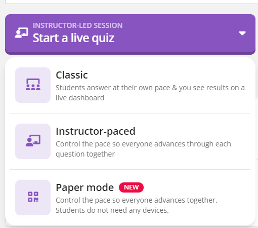 Prilikom dijeljenja kviza s učenicima u realnom vremenu, birate između tri opcije (Slika 10):