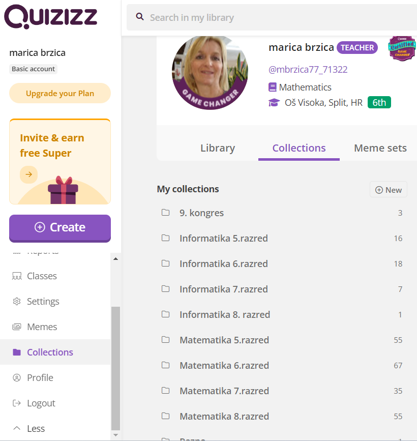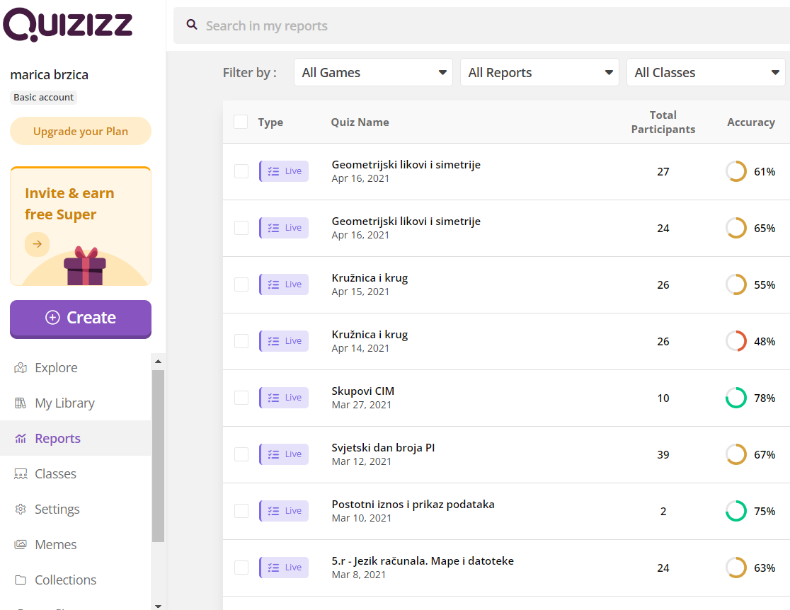 Vaše kvizove i lekcije možete sistematično smjestiti u mape (izbornik Collections – Slika 11a), pratiti rezultate učenika i riješenost kvizova po zadatcima, ali i printati izvještaje te ih slati mailom roditeljima (izbornik Reports – Slika 11b).