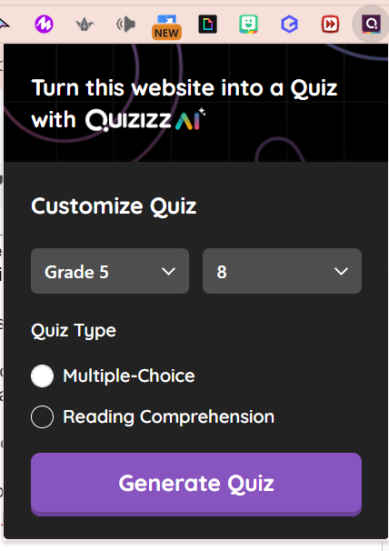 Uz sve nabrojeno, Quizizz ima Chrome proširenje koje putem umjetne inteligencije formira kviz na osnovi sadržaja koji se nalazi na bilo kojoj web stranici. Važno ga je aktivirati na odabranoj web stranici (Slika 12).