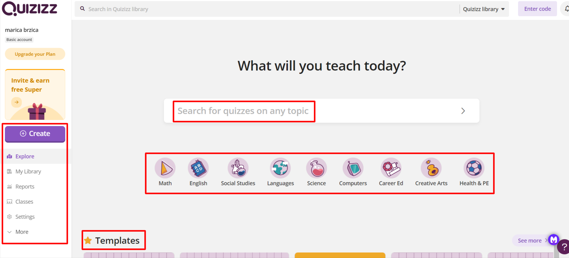 Nakon ulogiravanja naći ćete se na početnom sučelju alata gdje su smješteni predlošci iz kojih možete na brzi način kreirati kviz. Osim njih, možete pretraživati i koristiti javno dostupne kvizove i lekcije koje je lako pretražiti po područjima, temama, autorima i sl. Da biste si olakšali pretraživanje javno dostupnih kvizova, najlakše je koristiti tražilicu. Na lijevom dijelu početnog sučelja nalaze se glavni izbornici koji omogućavaju izradu i sortiranje svojih kvizova i lekcija. Ako se poželite vratiti na početno sučelje, odaberite u tom izborniku Explore (Slika 2).