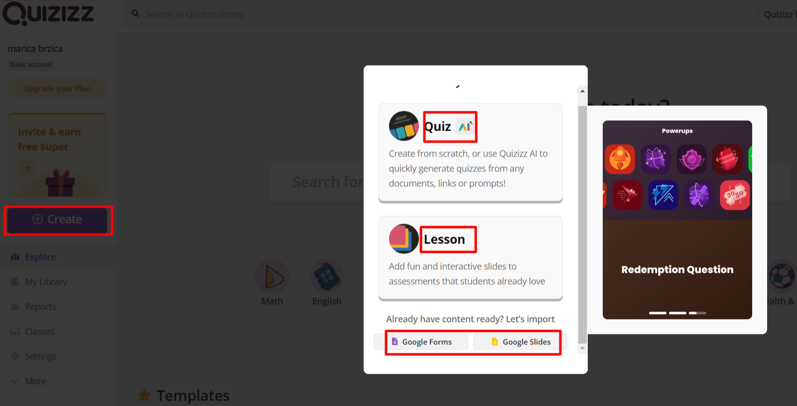 Krenimo s kreiranjem kviza ili lekcije. To ćete učiniti tako da odaberete ljubičasti gumb na kojem piše Create, a nalazi se neposredno iznad izbornika Explore.
