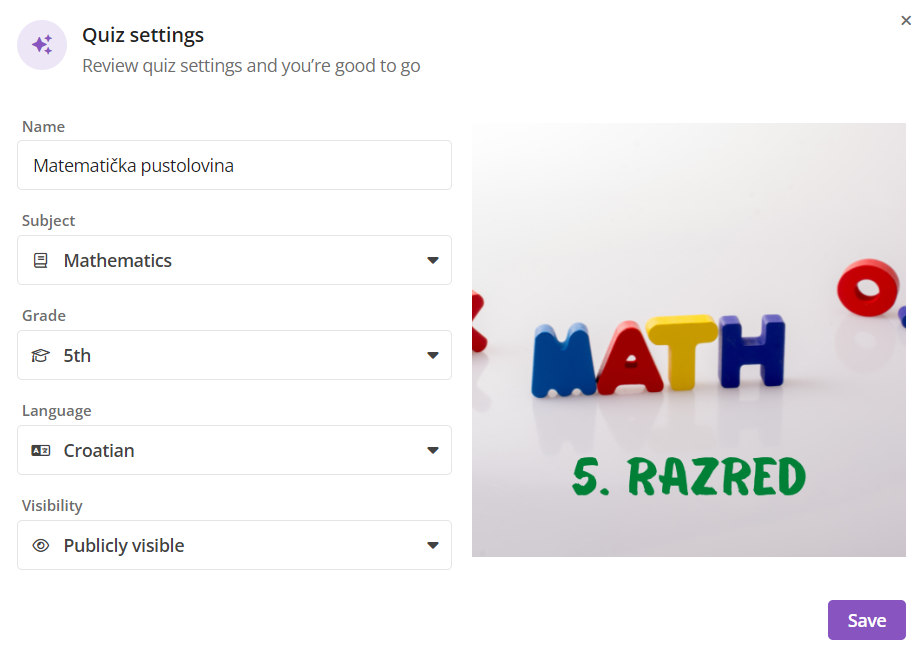Imenujte svoj kviz. Odredite uzrast učenika kojem je namijenjen, područje koje pokriva, jezik na kojem je napisan. Možete učitati i sliku koja će predstavljati vaš kviz na Quizizz platformi. U besplatnoj verziji, svaki kreirani kviz je javno dostupan i ne možete mu mijenjati postavke privatnosti (Slika 4). Sve ovo olakšava pretraživanje javno dostupnih kvizova unutar izbornika Explore. S obzirom na to da i sami koristimo javno dostupne kvizove koje su podijelile naše kolegice i kolege, lijepo je podijeliti i svoje uratke sa zainteresiranim učiteljima i učenicima.