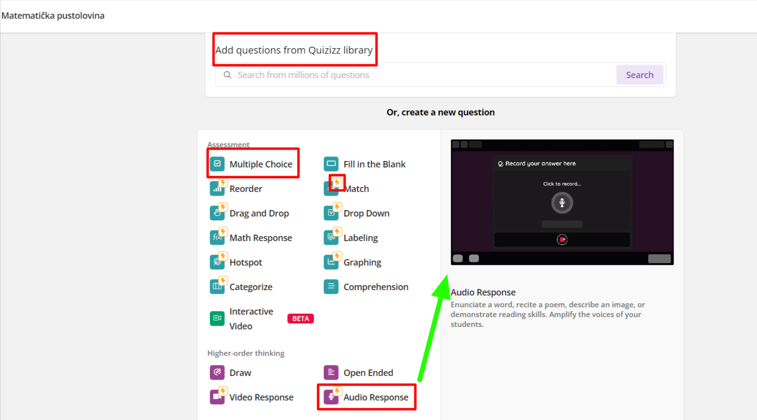 Ako želite umetnuti svoja pitanja, nabrojani su tipovi pitanja koji su besplatno dostupni, ali i oni koji se koriste samo u plaćenoj verziji. Sve što ne ulazi u besplatan Quizizz plan, označeno je simbolom “žute munje”.