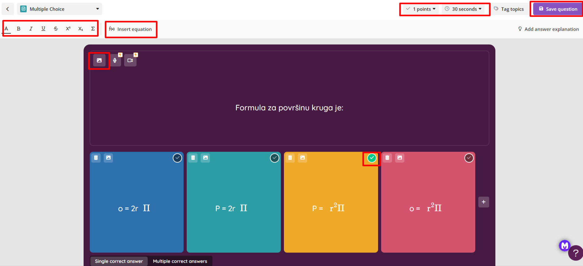 Klikom na odabrani tip pitanja krećete s kreiranjem istog. Izrada pitanja s višestrukim odabirom, kao i izrada ostalih tipova pitanja, je vrlo intuitivna. Na mjesto pitanja ukucajte sadržaj pitanja koji možete dodatno editirati korištenjem tekstualnog editora koji se nalazi gore lijevo. Ako želite upisati matematičku formulu, na istom ćete mjestu naći i matematički editor. U pitanju, a i u svim opcijama odgovora, osim teksta, možete učitati i sliku. Ne zaboravite kvačicom označiti točan odgovor ili odgovore. Gore desno odredite vrijeme koje ćete rezervirati za odgovor na ovo pitanje te odredite broj bodova koje donosi točan odgovor. Kad ste zadovoljni svojim radom, kliknite na ljubičasti gumb gore desno s natpisom Save question (Slika 6).
