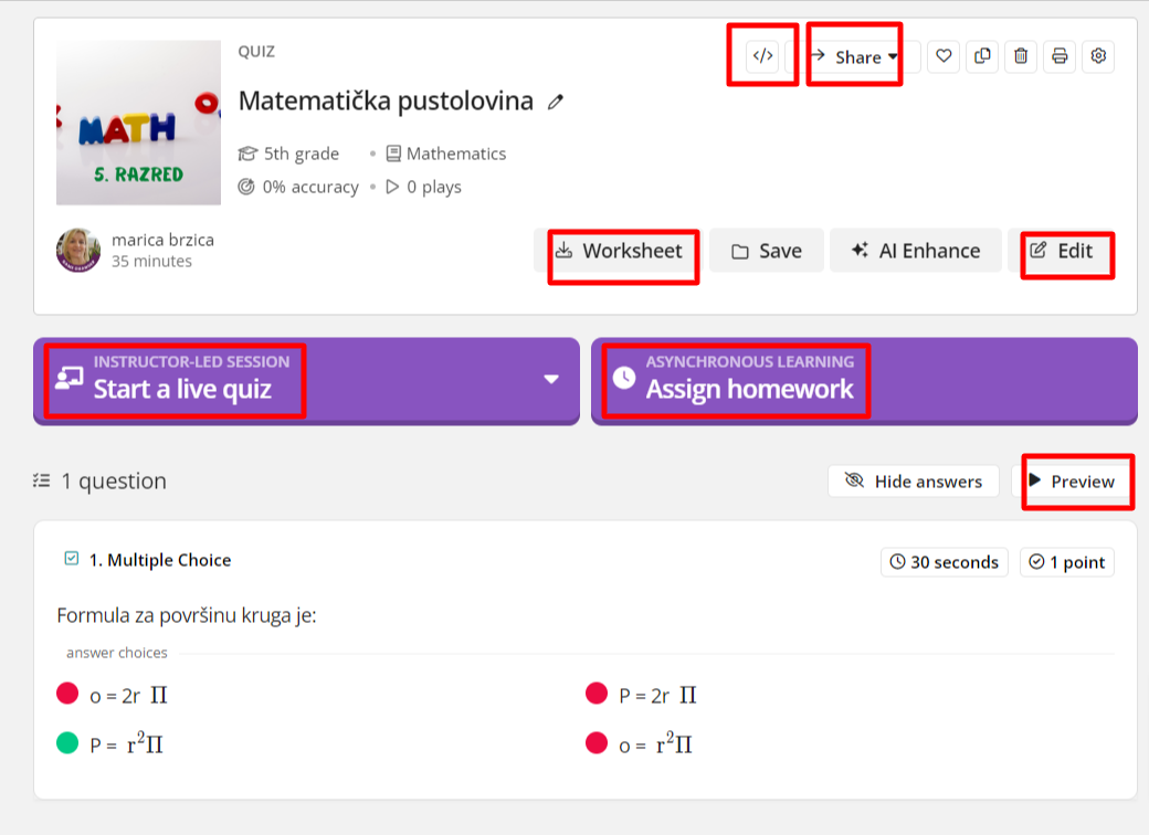 Nakon što ste kviz učinili javnim, možete ga podijeliti s kolegama pomoću poveznice ili pozivom direktno na mail (Share), stvoriti ugradbeni kod te ga ugraditi na npr. web stranicu ( </> ). Ako želite da ga učenici rješavaju bez uporabe digitalnih tehnologija, možete ga isprintati u fizičkom obliku (Worksheet). Ako poželite nešto promijeniti, postoji gumb i za to. Kliknite na Edit te mijenjajte što god želite. Pomoću gumba Preview možete vidjeti kako kviz izgleda kad ga se pokrene.