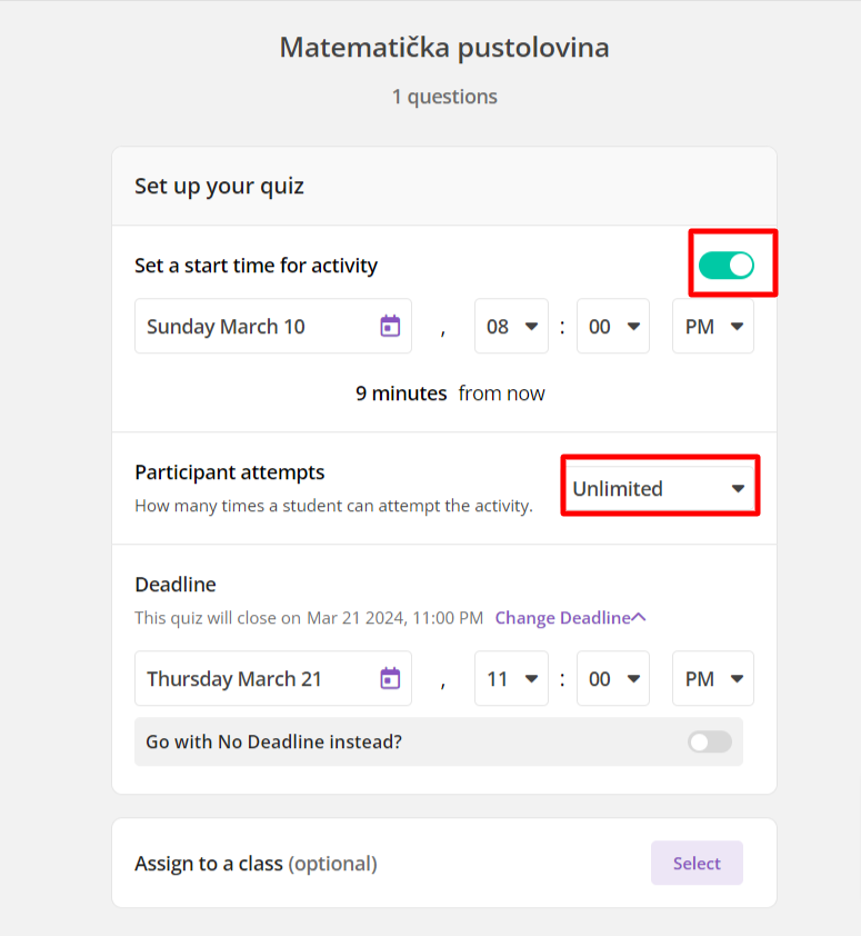 Prilikom zadavanja kviza za domaću zadaću, sami određujete vremenski interval unutar kojeg učenici mogu riješiti kviz. Ako ne želite limitirati vremenski pristup kvizu, ne morate. Savjetuje se odabrati neograničeni broj pristupa kvizu jer takav pristup ne traži nikakvo ulogiravanje učenika (Slika 9). Naime, svaki kviz možete podijeliti sa svojim učenicima pomoću poveznice ili koda, a bez potrebe registracije učenika u sam alat.
